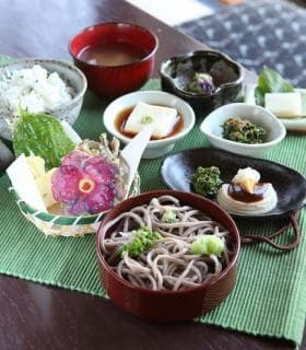 献立は、奥出雲町内で採れた安心安全な山野菜を使用し、旬を味わうことができます。深山の季節の味を移り変わる風情とともにお楽しみ下さい。卜藏御膳1,700円※要予約、椿御膳1,200円、割子そば800円。