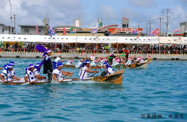 海の恵みに感謝し「大漁」と「航海安全」を祈願する行事。当日は、山巓毛(サンティンモー)という高台でウガン(御願)をすることから始まります。この御願が終わったあと、ハーレー競漕が始まります。ハーレー競漕は、御願バーレー・クンヌカセー(転覆)・アガイスーブ・中学生・青年団・職域等多くの競漕が行われます。中でも最後を飾るアガイスーブは必見です。