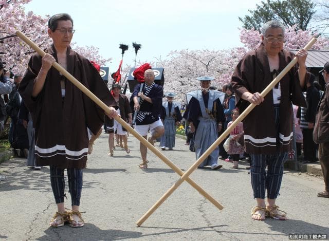 登城奴といわれ鉄砲,なぎなた,はさみ箱などをかつぎながら練り歩く。