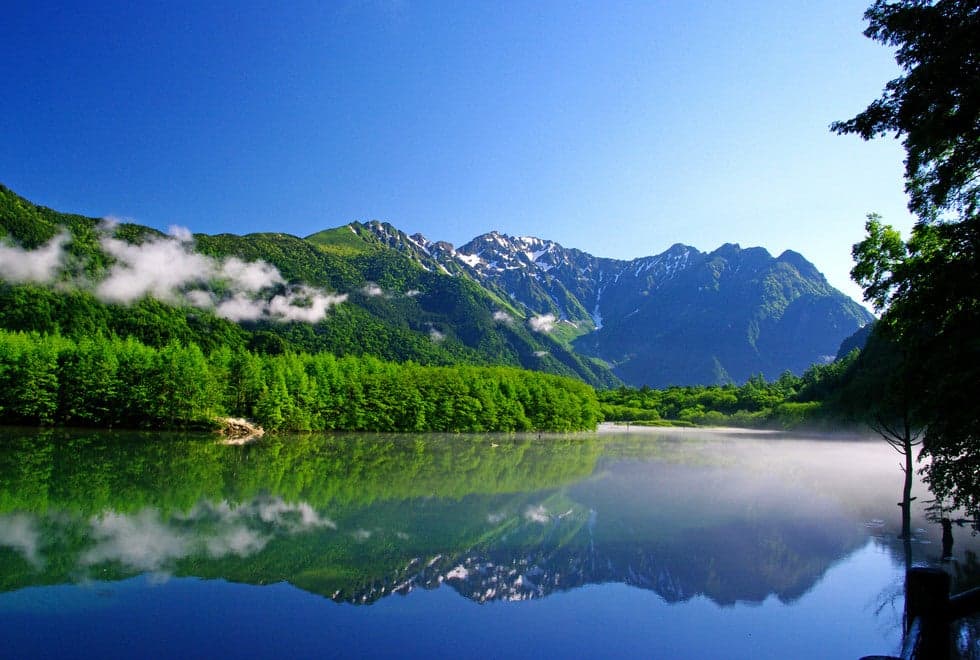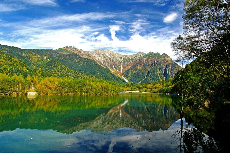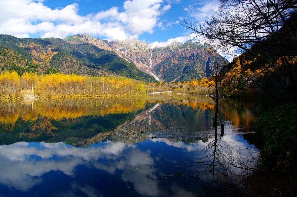 大正4年の焼岳大爆発により梓川がせき止められてできた池。穂高連峰と枯木が湖面に写る景観は、上高地ならでは。現在は下流の霞沢発電所の調整池として管理されています。