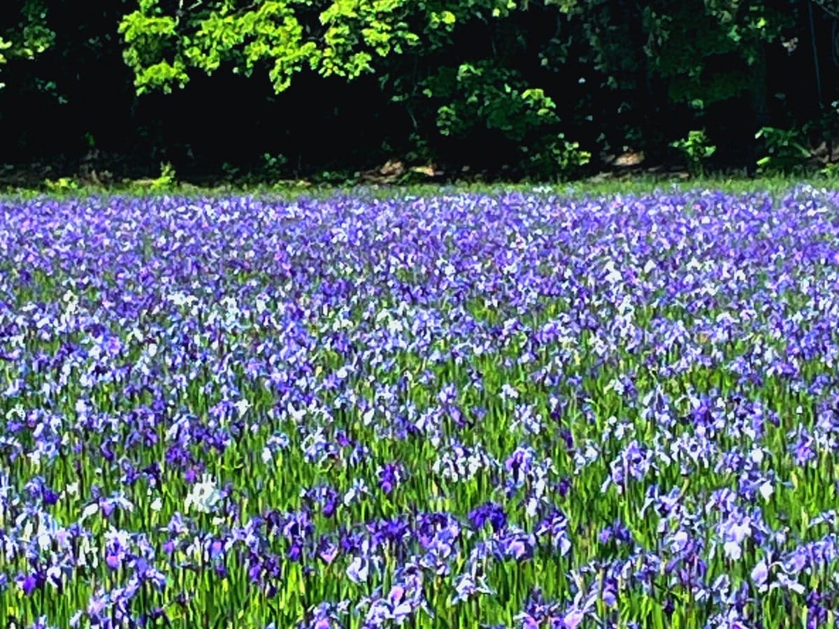 大積のカキツバタを守る会の方々が、池の周辺の草や、カキツバタに有害な外来種を除去し管理しています。5月中旬から6月初旬にかけて、濃い紫色、淡い紫色、白色のカキツバタが池一面を覆う様子は正に絶景。池の周辺は私有地です。観光地ではありませんのでトイレなどの施設がありません。マナーを守ってお楽しみください。