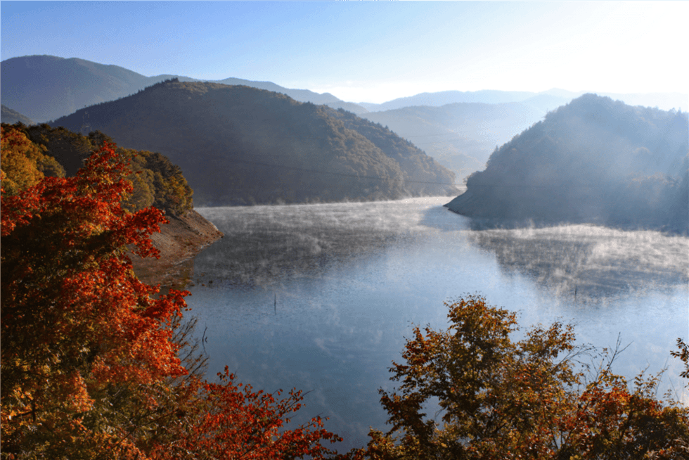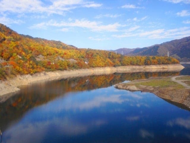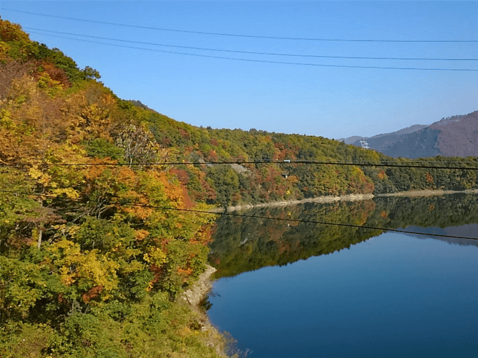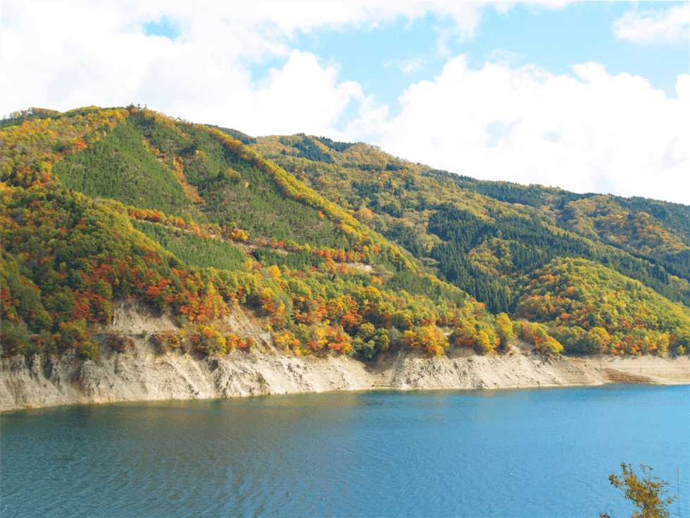現在でもロックフィルダムとしては総貯水容量が徳山ダムに次ぎ、日本第2位飛騨・美濃紅葉33選にも選ばれ、エメラルドグリーンの湖面と紅葉のコントラストが鮮やかです。