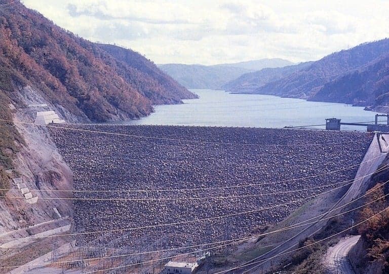 堤高131mのロックフィルダム(石や土砂、粘土を積み上げて、できているダム)で日本で初めての大規模ロックフィルダムの御母衣ダム。