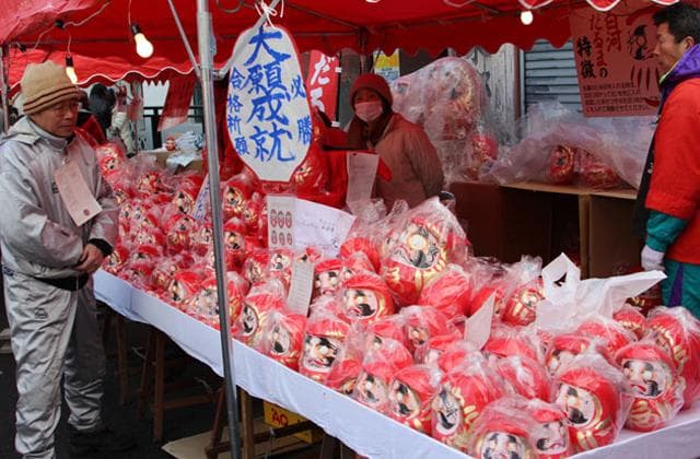 本町から天神町に至る市内の目抜き通りを中心におよそ700軒もの「白河だるま」などを売る露店が立ち並びます。白いだるまは「開運祈願」赤いだるまは「厄除け」と「家内安全」の御利益があるとされて、小さなだるまから買い始めて年々大きなものにしていく末広がりの縁起をかつぐ慣わしが今も残っています。当日は市内外から多くの買物客が訪れます。