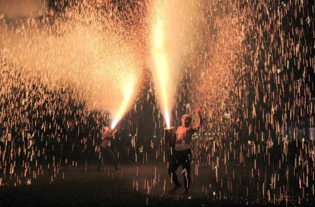 1年間、伊東温泉の旅館などで使用された箸を供養します。メイン会場の国道135号伊東バイパスでは、勇壮な神輿のパレードなどのアトラクションが充実しています。フィナーレを飾る“手筒花火”は迫力満点で、吹き上がる火花は、打上花火とはまた違った見ごたえがあります。また、打上花火(約1,500発)も海上2ヶ所から打ち上げられます。