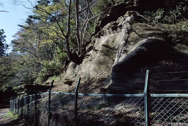 砂岩層に貝の破片による美しい縞模様を描く地層。国の天然記念物。