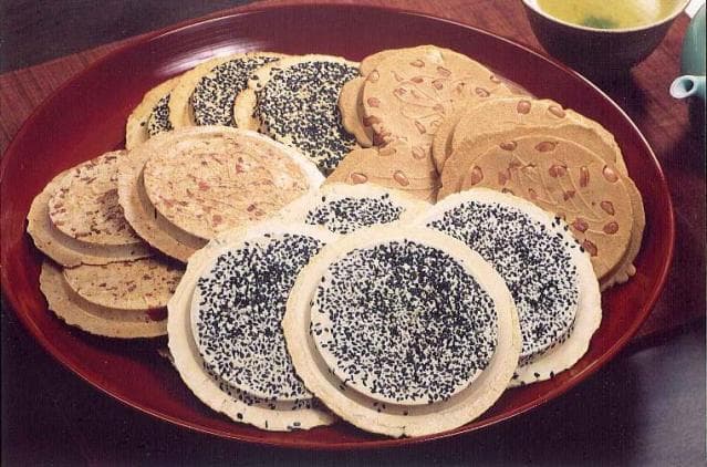 南北朝の戦乱期、難を逃れて陸奥へきた長慶天皇が、片田舎で食糧か尽きた折り、お供の赤松某が農家からそば粉とゴマ、塩を手に入れて鉄かぶとで焼いて差し上げたのが起源とか。後におやつや主食として南部地方に伝えられました。南部せんべいは小麦粉をこね、ゴマをまぶして型に入れ堅く焼き上げたもので、淡白のうちにもゴマと塩の味で独特の風味があり、かむほどに味が出てくる素朴なものです。