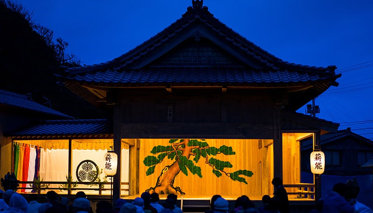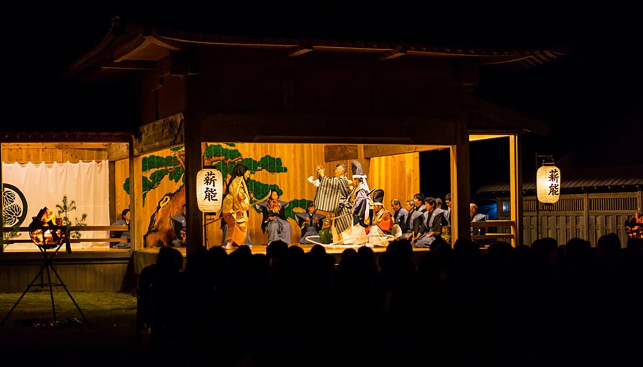 能楽師出身である佐渡代官(初代佐渡奉行)の大久保長安により、相川春日崎に春日神社が建てられたのは1605年で、1619年に現在の場所に移されました。1645年に能舞台が建てられ、佐渡で初めて神事能が奉納されます。現在の舞台は、羽茂滝平の諏訪神社から譲られ、2006年に移築。春日神社建立400年を機に地元住民の熱意により実現したものです。毎年数回の薪能をはじめ、いろいろな催しが行われています。