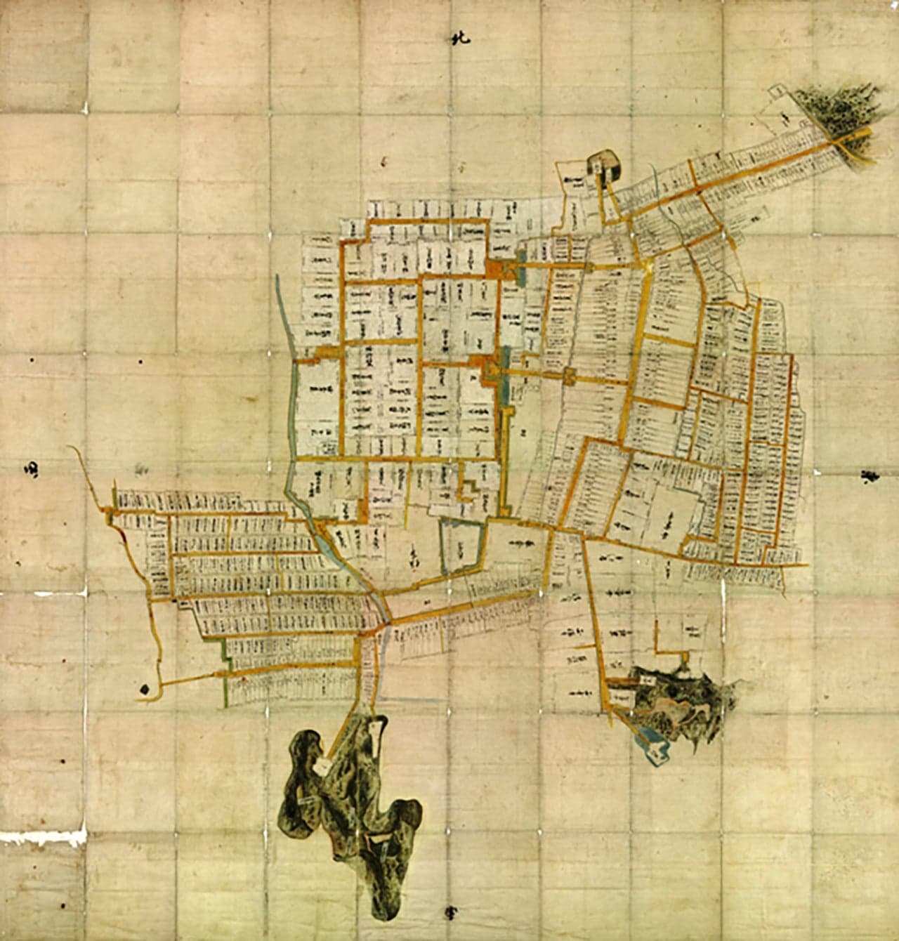 村松は、江戸時代には堀家三万石の城下町。正保元年(1644)堀直時を初代藩主として成立し、城下町もこのころから整備がはじまった。この城下図は、宝暦年間(1751~64)に作成された。縮尺は一間が一分の縮尺で道路幅や間口、奥行きなどが細かく書かれている。村松は数回の大火などで多くの資料が焼失しており、この絵図は当時の城下町村松の様子を伝える大変貴重なもの。