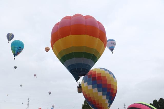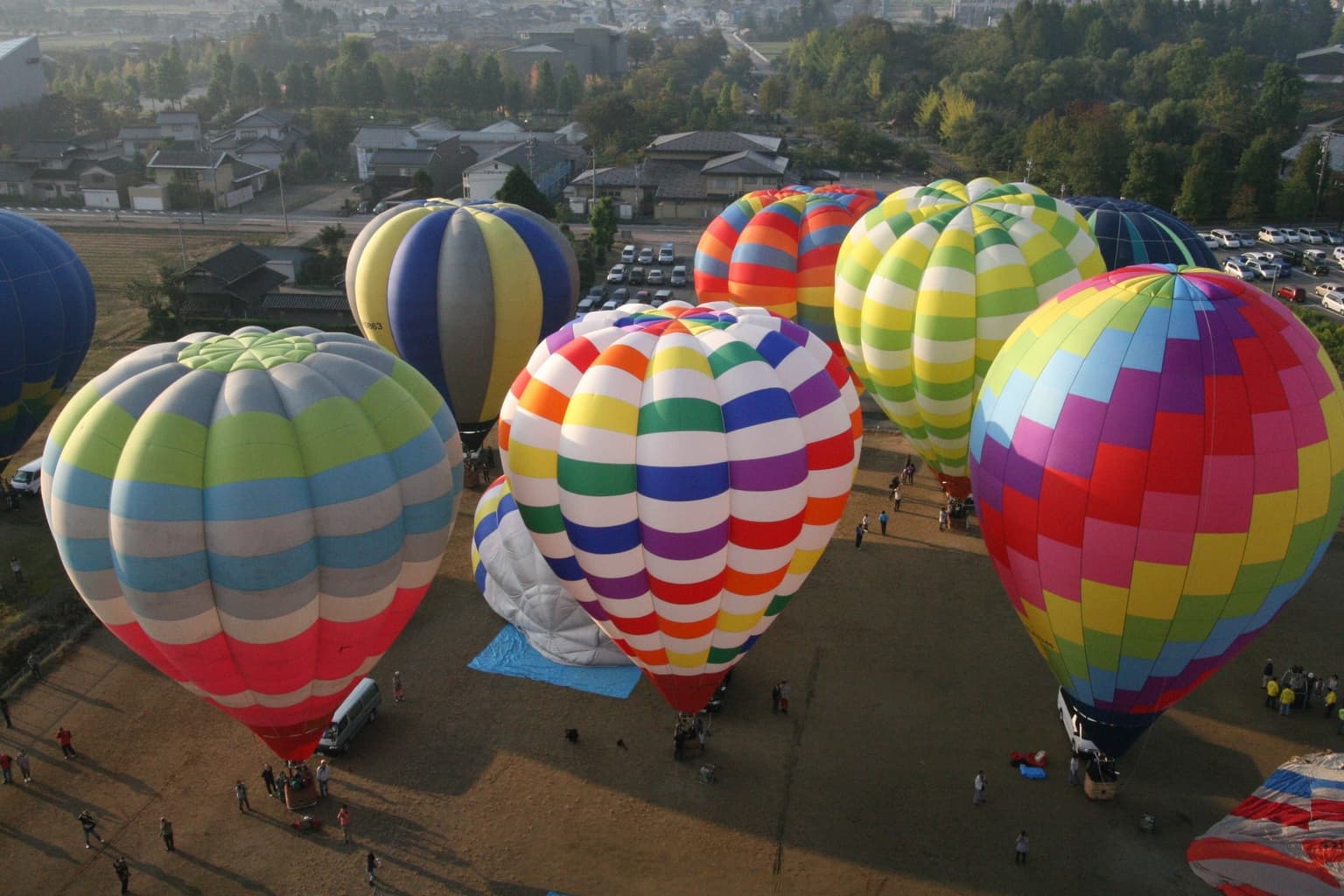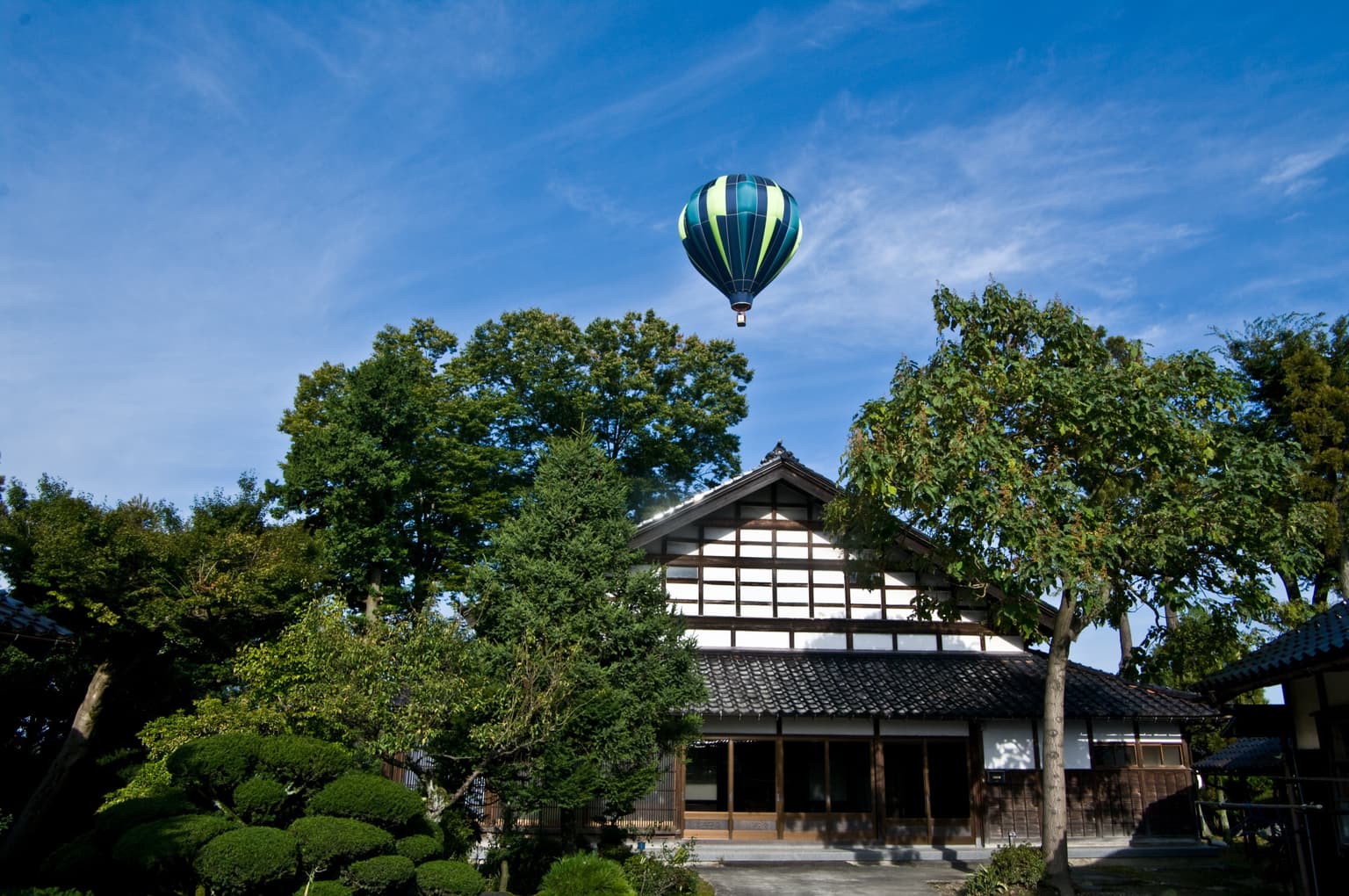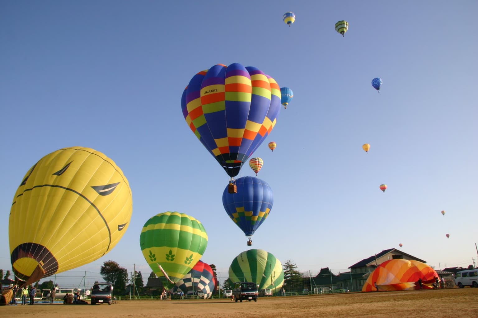 散居の里で開かれる、スカイスポーツの祭典「スカイフェスとなみ2025」。カラフルな熱気球がとなみ野の秋空を彩ります。緑の屋敷林が点在する散居村を見下ろしながら、多彩なバルーンが優雅に空中散歩を楽しんでいます。