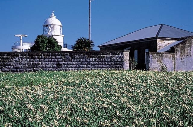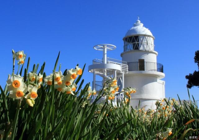 日本最古の石造灯台の敷地内一帯スイセンの群落が広がっています。