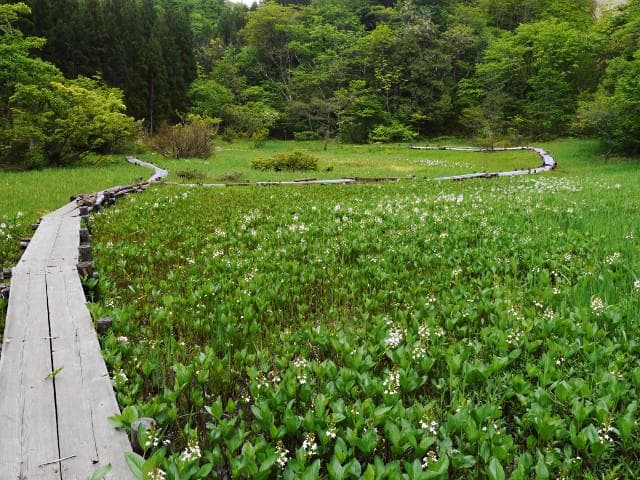 米集落の水源である米湿原。雪解けとともにギフチョウが舞い飛び、初夏にはキンコウカが咲き乱れ、ヤマセミの声を背に、カモシカが横切ります。希少な植物が数多く自生しています。