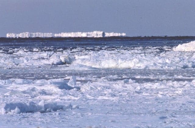 流氷が去った後のよく晴れた日、遠く沖合いに巨大な流氷が浮かび上がることがあります。これが『幻氷』と言われる蜃気楼です。 海上の冷たい空気の上に、春の暖かい空気が流れ込み、密度の違う空気の層が光を屈折させて流氷の姿を海上に浮かび上がらせるのです。 春を迎えて北へと帰っていく流氷が、私たちに別れの挨拶をしてくれているのかもしれません。