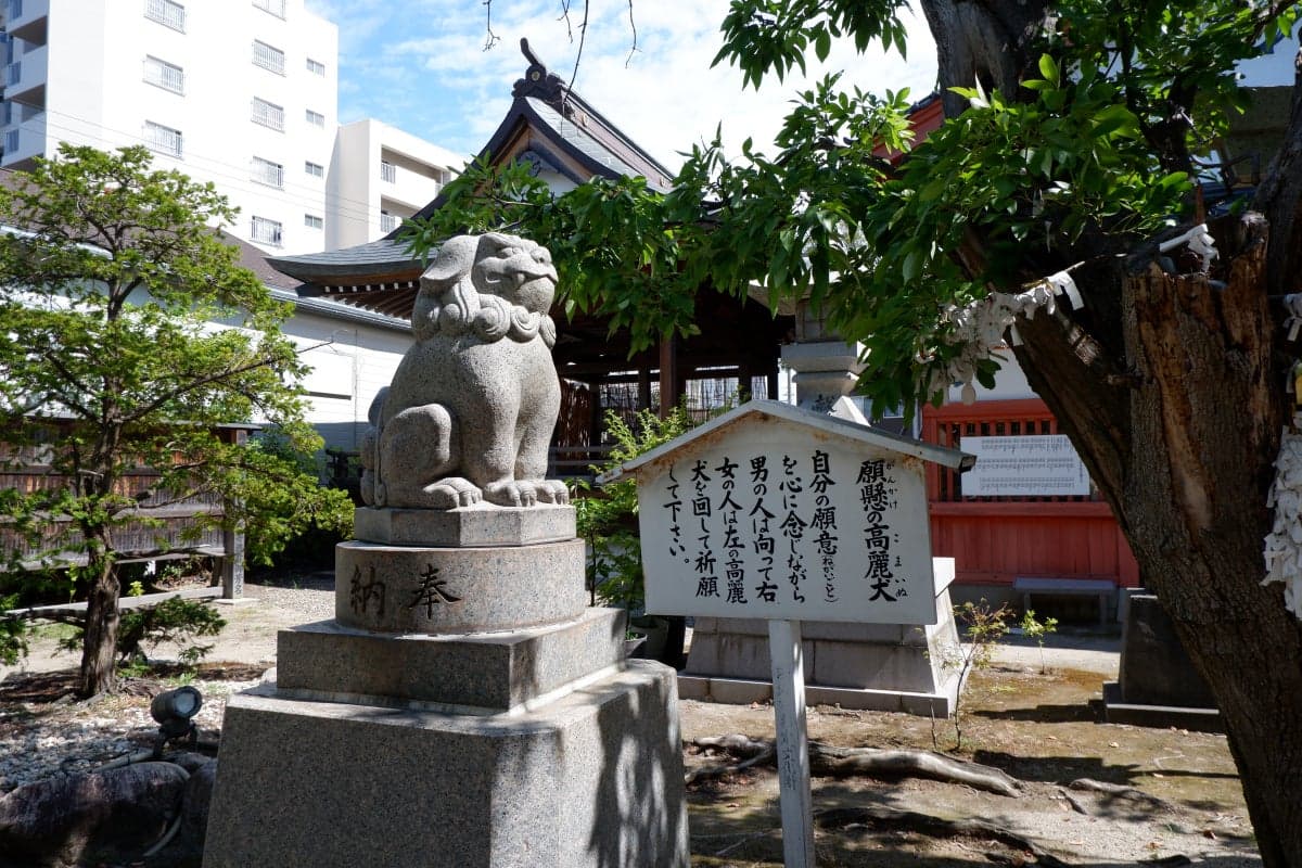 昔、花街の女性達が港から船乗りが出て行かないよう、高麗犬の向きを変え、荒天祈願をしたのがはじまり。