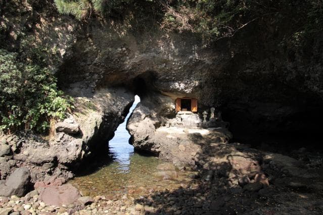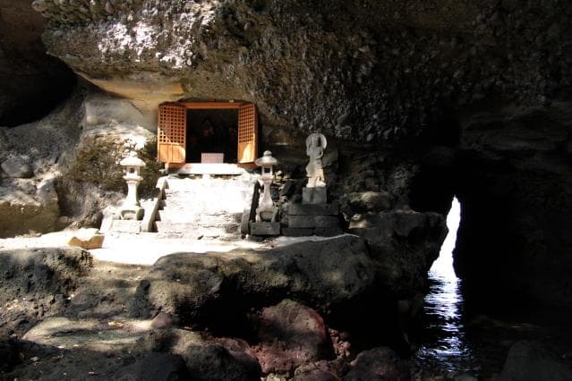 長崎鼻の海蝕洞窟は、県の天然記念物に指定されています。海蝕洞窟は長い時間をかけて風化、水食された洞窟です。最大のものは行者洞窟と呼ばれ、直接海水が入る珍しい洞窟で修験者の修行の場といわれてます。