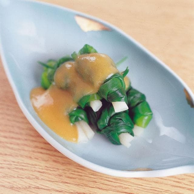 一文字という小ネギをゆでて、白根の部分の回りに青葉の部分を巻きつけ、辛子酢味噌で食べるもの。酒の肴に好適。