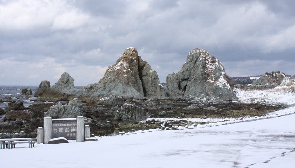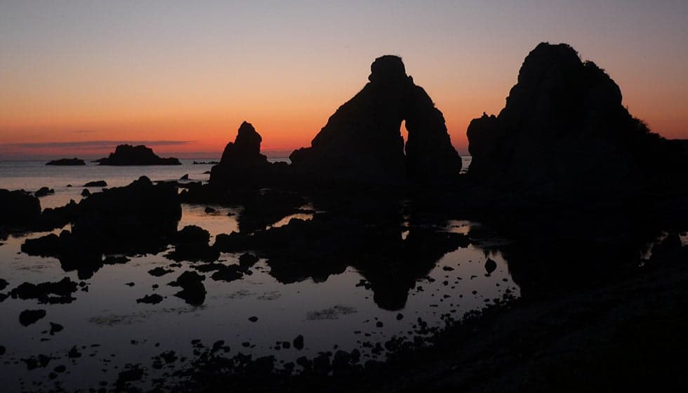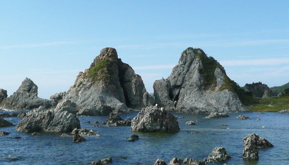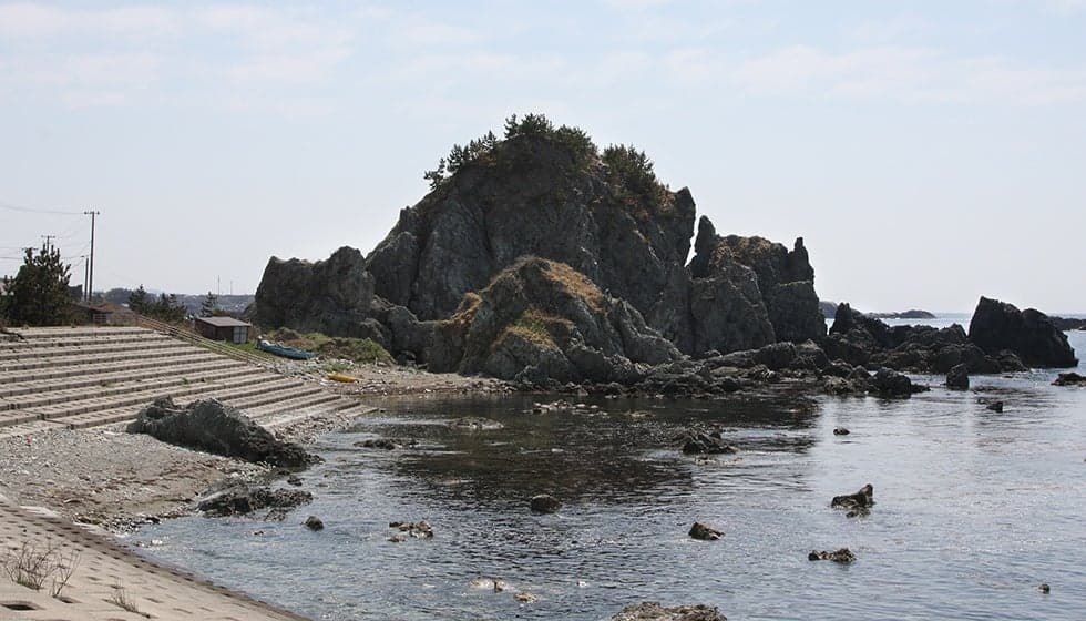 「古事記」の国生み神話に由来するとされる大きな二つの岩。向かって右が夫の岩で高さ22.6m、左側が妻の岩で高さが23.1m。七浦海岸の波を受けて寄り添うように立ち、縁結びのご利益も期待されます。国生み神話の伝説として佐渡に伝わる「猫岩」「帆かけ岩」など周辺には岩礁が散在し、自然の造形美を楽しむことができます。