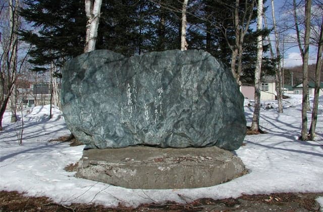 国語学者である金田一京助がアイヌ語研究のため来町した際に詠んだ詩を記念の碑にしたものです。「物を云わじ声を出さじ石はただ全身をもって己を語る」という詩が刻まれています。萱野茂ニ風谷アイヌ文化資料館前の静かな林の中にあります。