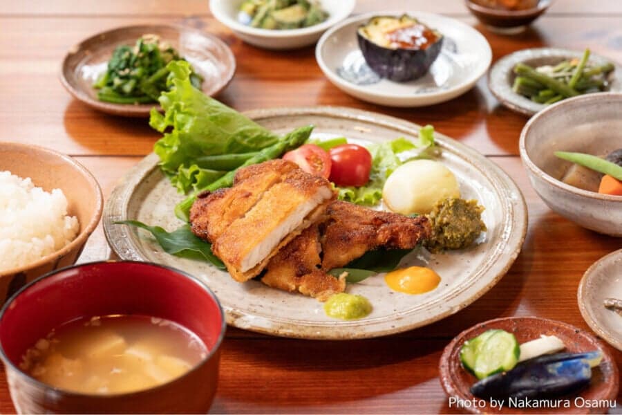 1924年築、越後中門造りの茅葺き民家を「やきもの」で再生しました。1階には、日本を代表する陶芸家たちが手掛けたいろり、かまど、洗面台、風呂、そして地元の食材を使った料理を陶芸家の器で提供する作品兼レストラン。2階は3つの茶室から成るやきものの展示空間。温もりのあるやきものと茅葺民家、集落の女衆たちの溌剌とした笑顔とおしゃべりが人気を集めています。