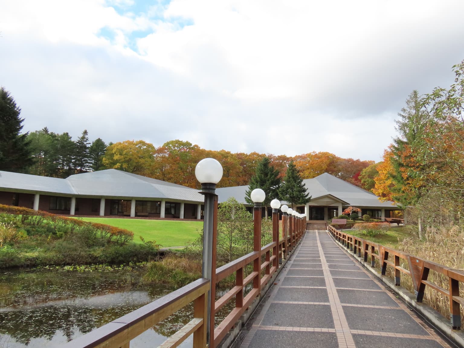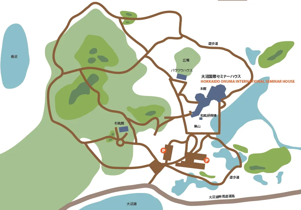 JR大沼公園駅から約2㎞、大沼国際セミナーハウスの敷地内に広がる森林公園には全長約3.3km程の遊歩道があり、自然散策や野鳥観察が楽しめる。セミナーハウス館内には森を眺めながら落ち着いたひと時を過ごせるコワーキングスペースがある他、別棟の杉風館も休憩に利用できる。
