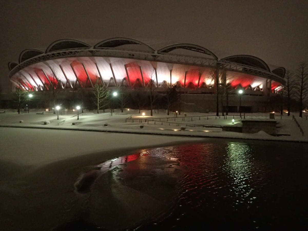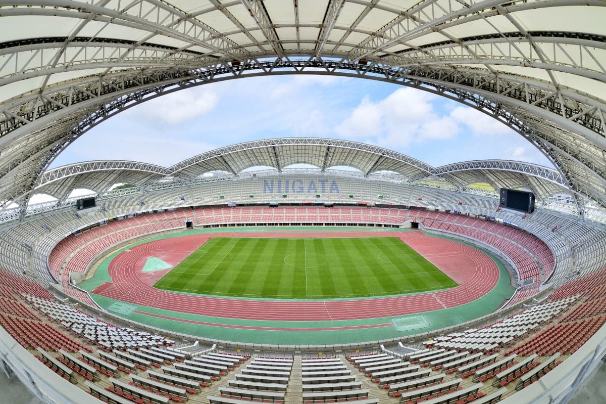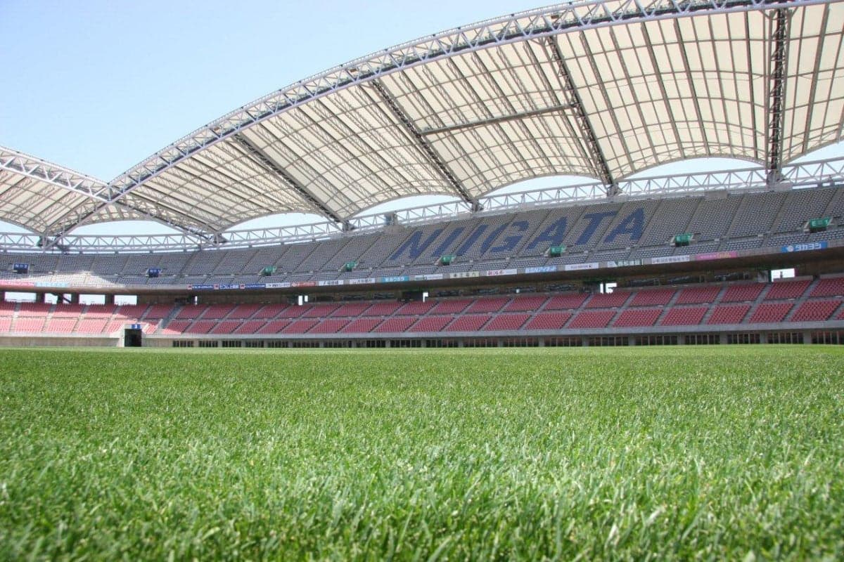 新潟県スポーツ公園内にある陸上競技場。大きなクロスアーチとサブアーチにより構成されるフォルムが、スタジアムの前面に広が鳥屋野潟に飛来する白鳥のイメージにつながり、“ビッグ スワン”の愛称で親しまれています。