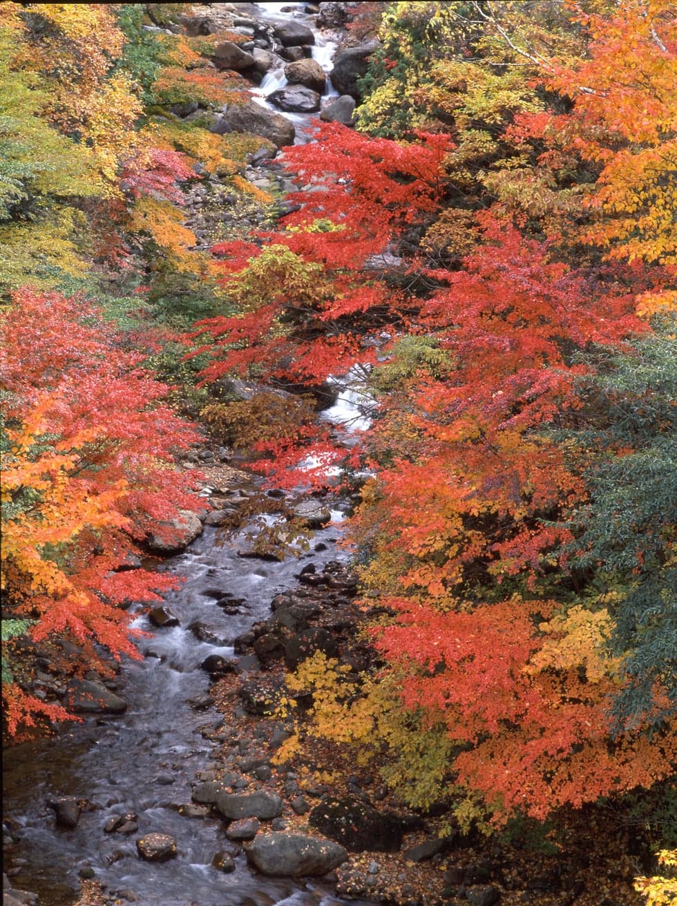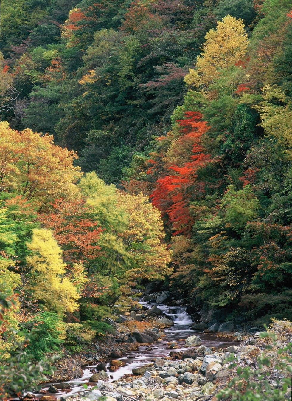 自然林の美しさを残した松川渓谷。春を彩るオオヤマザクラと新緑、ミズナラ、カエデ類が織りなす紅葉のグラデーションは多くの観光客に人気があります。自然美を特等席で味わえるのが、山田温泉、松川渓谷温泉、五色温泉、七味温泉などの渓谷沿いの温泉。客室やロビー、露天風呂からの展望をお楽しみください。