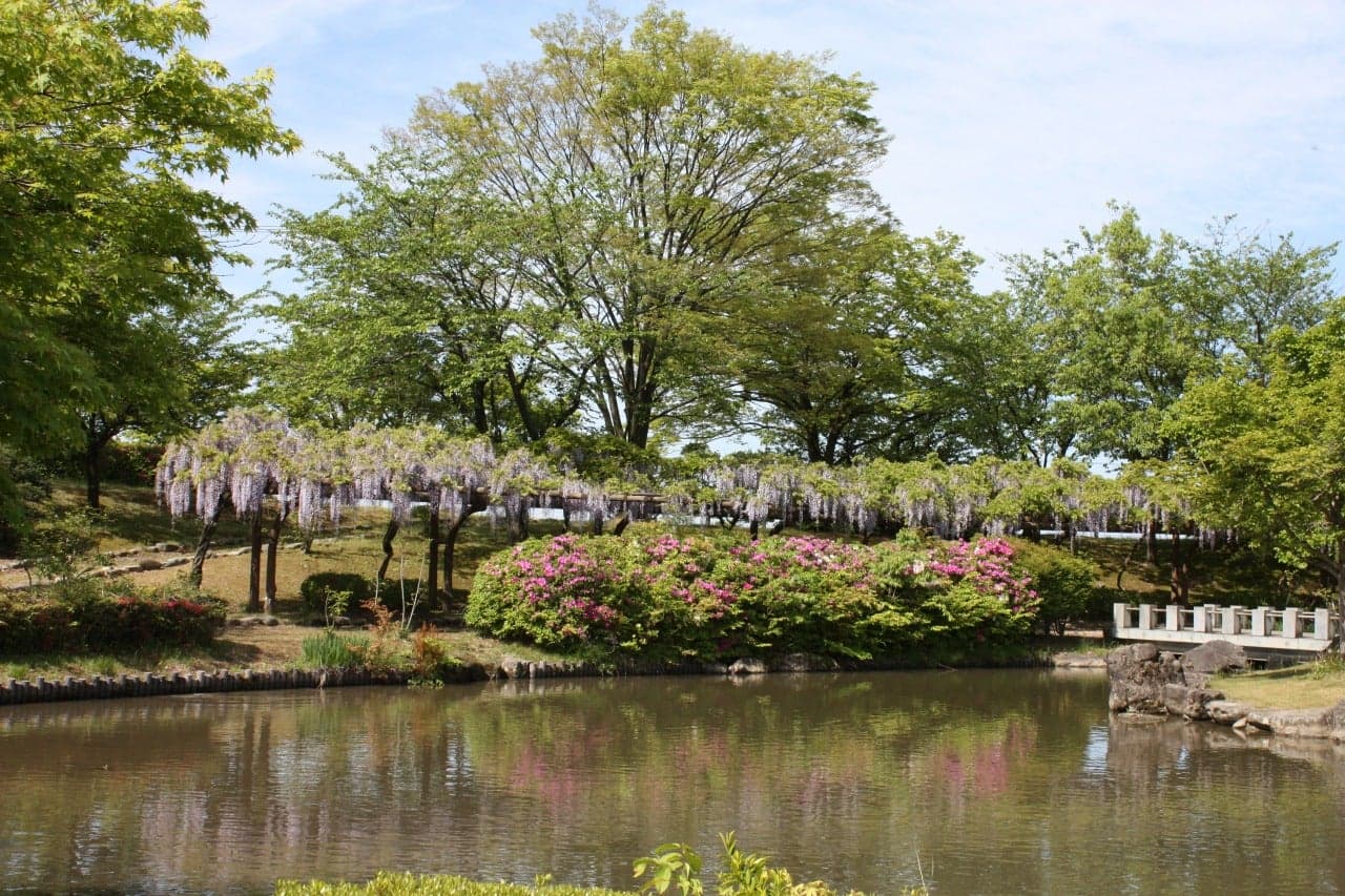水と緑の広場には、大池や水車小屋、全長約310メートルの藤棚などがそろっています。