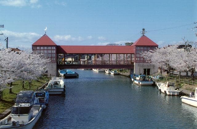 スペインの建築家セザール・ポルテラ氏に基本デザインを依頼した、全国でも珍しい歩行者専用の屋根付き橋。