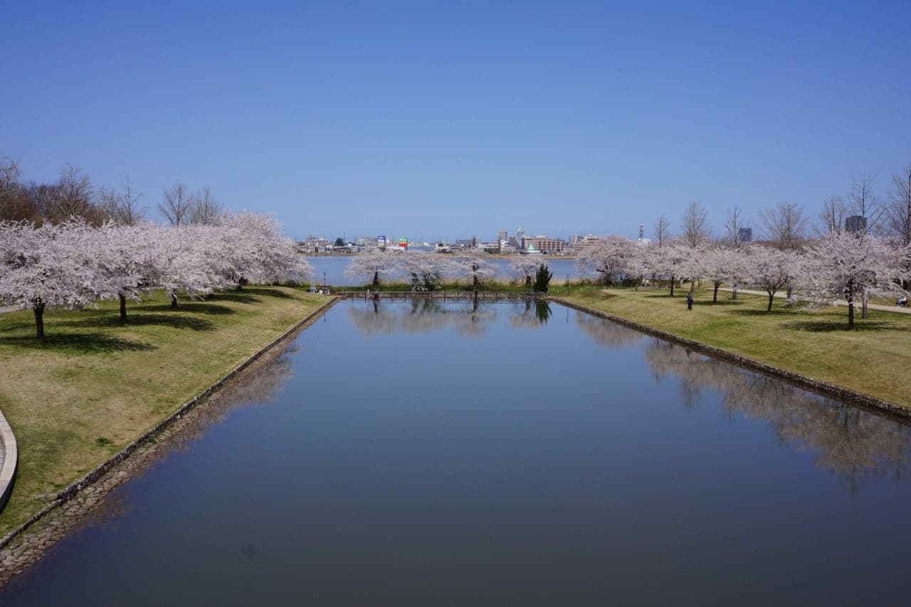 JR新潟駅から約2km、都市部に接している湖・鳥屋野潟(とやのがた)。周囲には桜が咲き誇り、湖の南側は大規模な公園として整備されています。