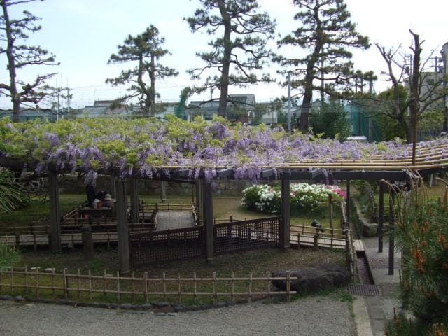 日本でも有数の規模を誇る樹齢200年を超える大藤を含め、園内には3箇所の藤棚があります。また、見頃に合わせてライトアップを行っています。