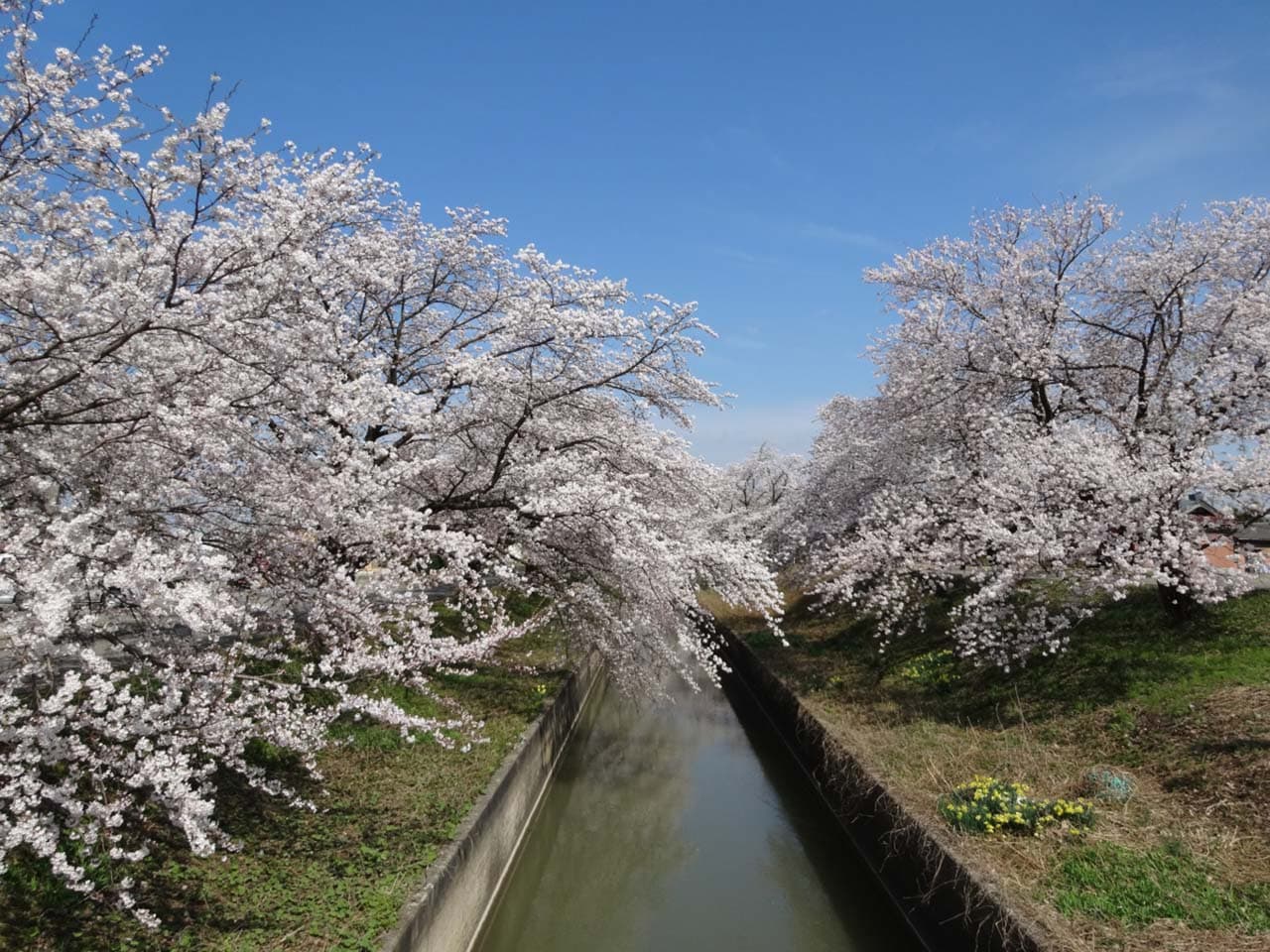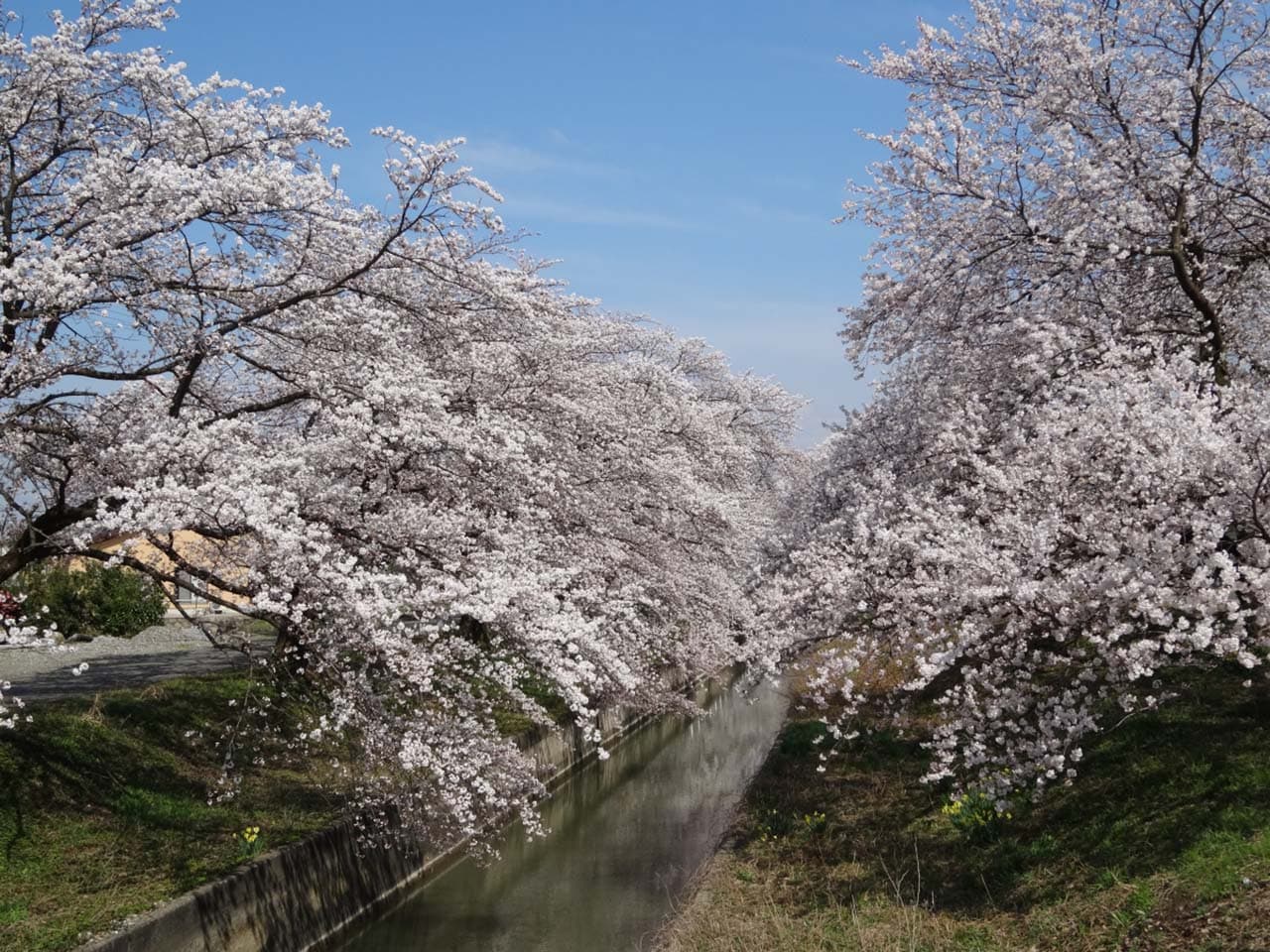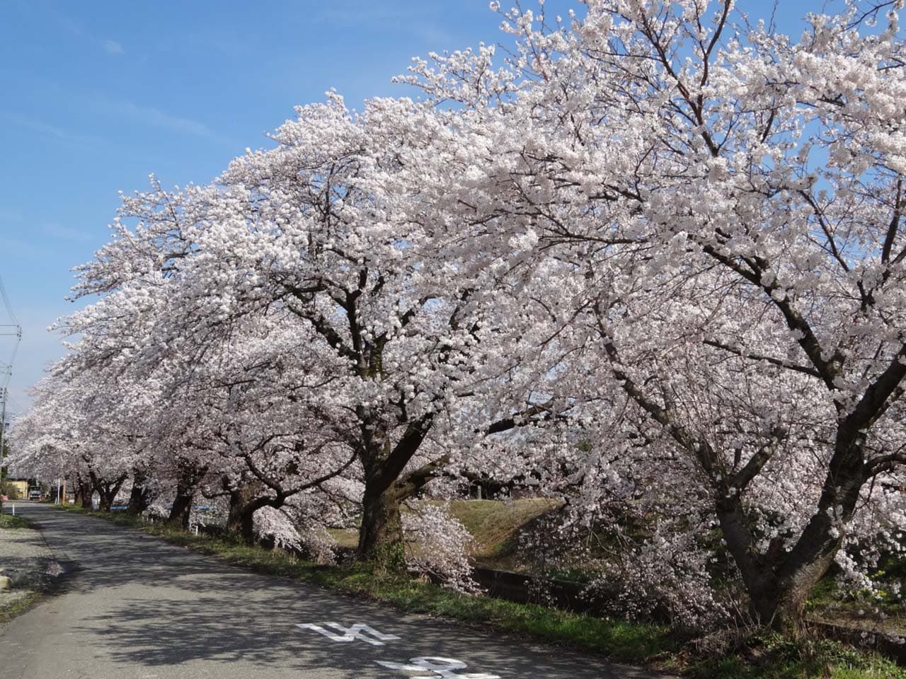 新江用水路の道路沿い約4.6kmにわたってソメイヨシノ550本が咲き誇ります。