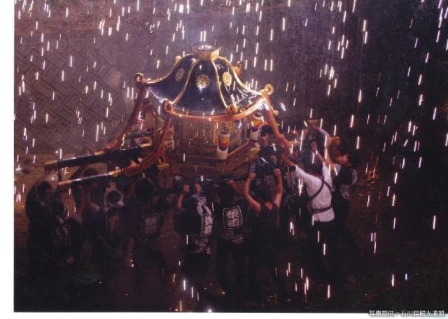 夕刻から曳山、獅子舞、夜は御輿が飯山川を渡る。