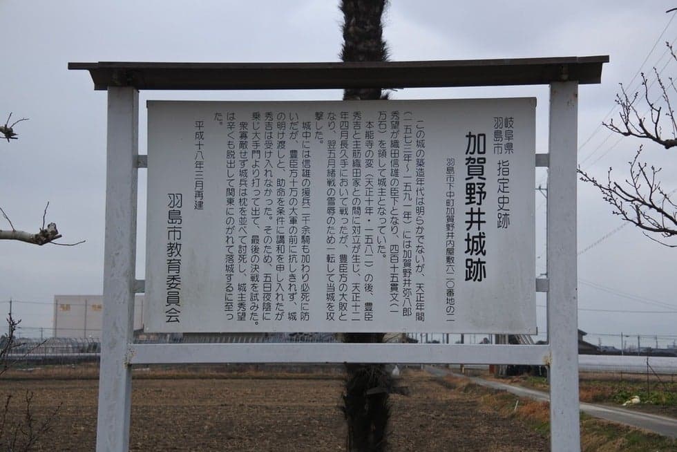 慶長5年(1600年)8月22日、木曽川下流の尾越に向かった福島正則・細川忠興・黒田長政・田中吉政・藤堂高虎らの東軍約16000は、対岸に西軍が柵を設けて待ち構えているため、さらに下流の加賀野井から密かに渡河し、城主不在の加賀野井城を瞬く間に落としました。加賀野井城跡は、木曽川橋を下った右岸に位置しており天正年間(1573~1592)に加賀野井弥八郎秀望によって構築されたといわれています。城跡は、もと八町四方もあったと伝えられますが、今は田の道沿いに約50?ほど残るのみです。弥八郎は、織田信長に仕えていましたが、その死後は子の信雄に仕え一万石を領したといいます。この場所が、戦国の武将である加賀野井弥八郎の居城であるという確証はありませんが、弥八郎については石田三成の密命をおびて徳川家康を暗殺しようとしたと伝えられています。弥八郎の墓は、現在は知立市宝町に所在する宝蔵寺本堂裏の雑木林のなかにあります。また、岐阜市若宮町にある「弥八地蔵」は、弥八郎が黄金一枚で八町四方の土地を買って墓所としたものの後身だといわれています。