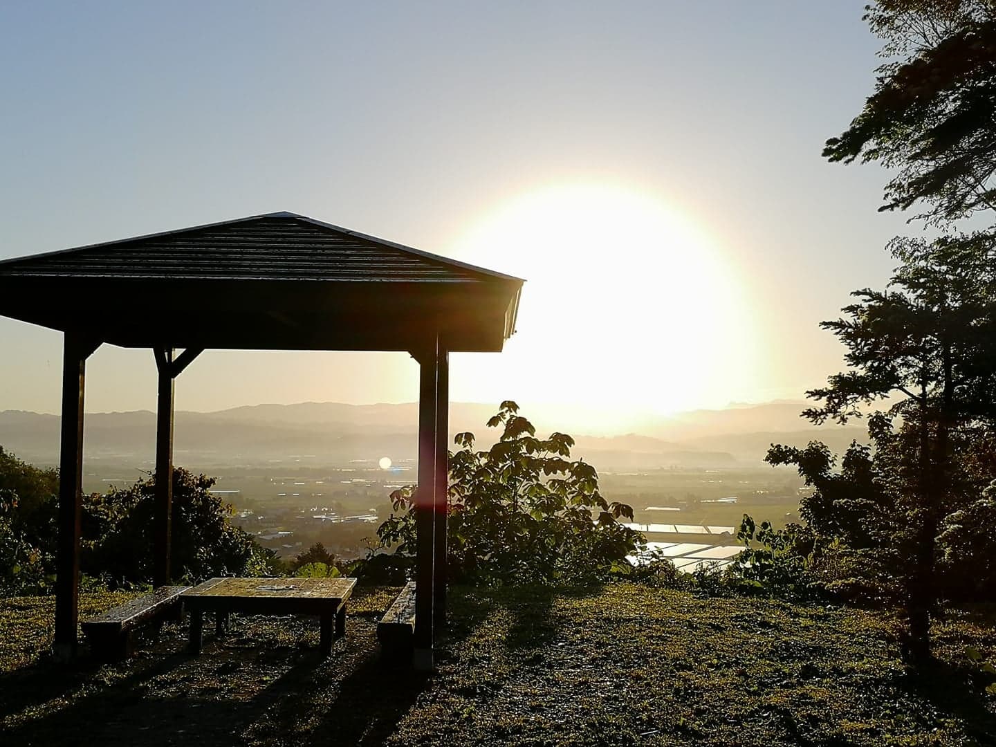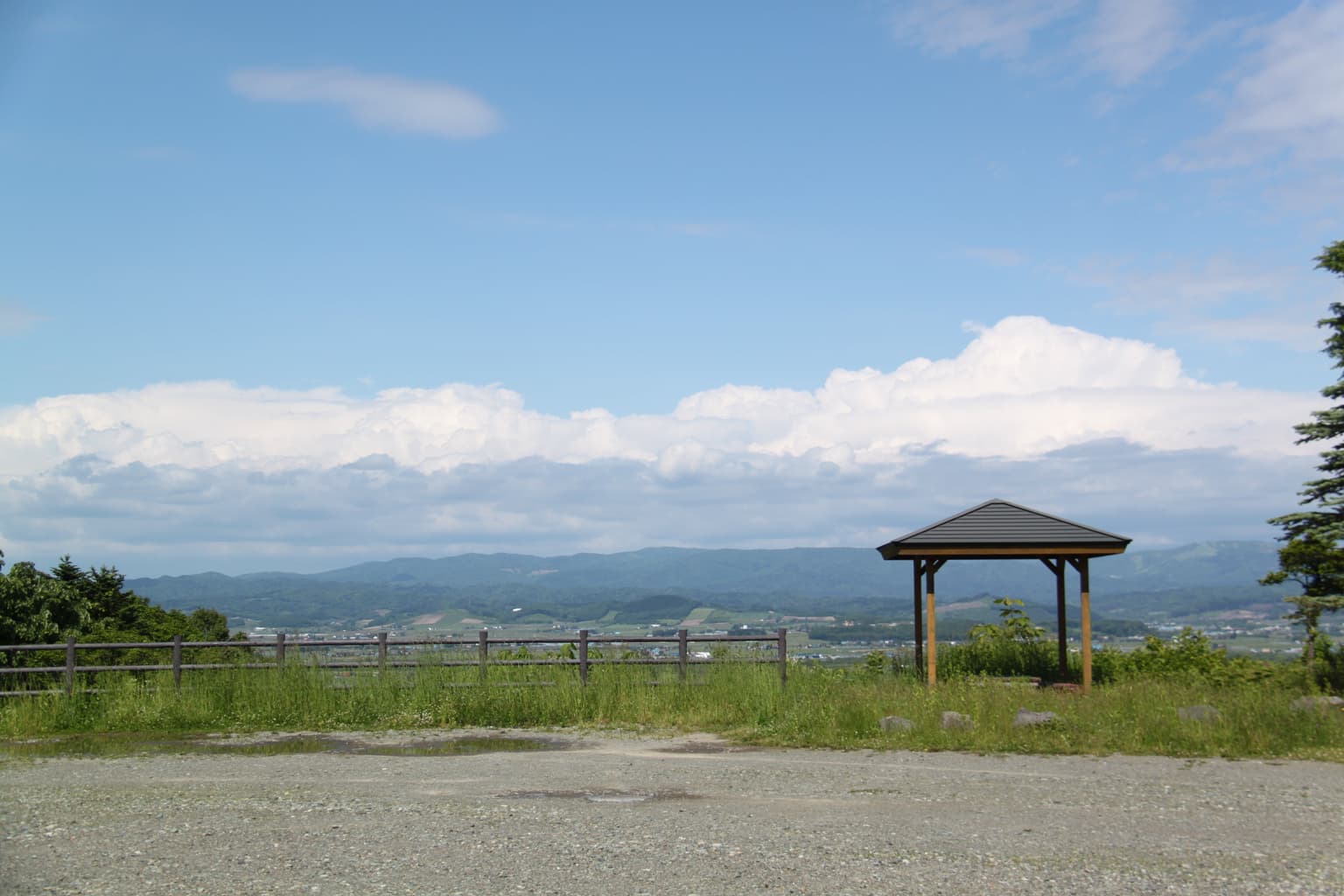 町内を一望できる伏見台は、標高146m、町の西南、馬追丘陵の一角、由仁駅から2㎞の地点にあります。展望台からは由仁町ののどかな田園風景が一望でき、遠くには夕張岳が望めるビューポイントです。秋は馬追山の紅葉がひときわ美しく、東に夕張岳を仰ぎ、眼下には黄金の稲穂が広がって波打つ姿が見られ、その景色はまさに絶景です。