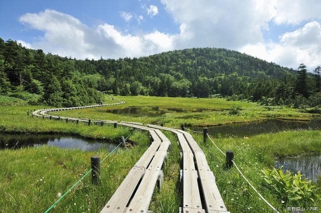 池の中にはサンショウウオやカエルが泳いでいる。この湿原を歩くために造られた木道の両側に高山植物が可憐な花を咲かせている。