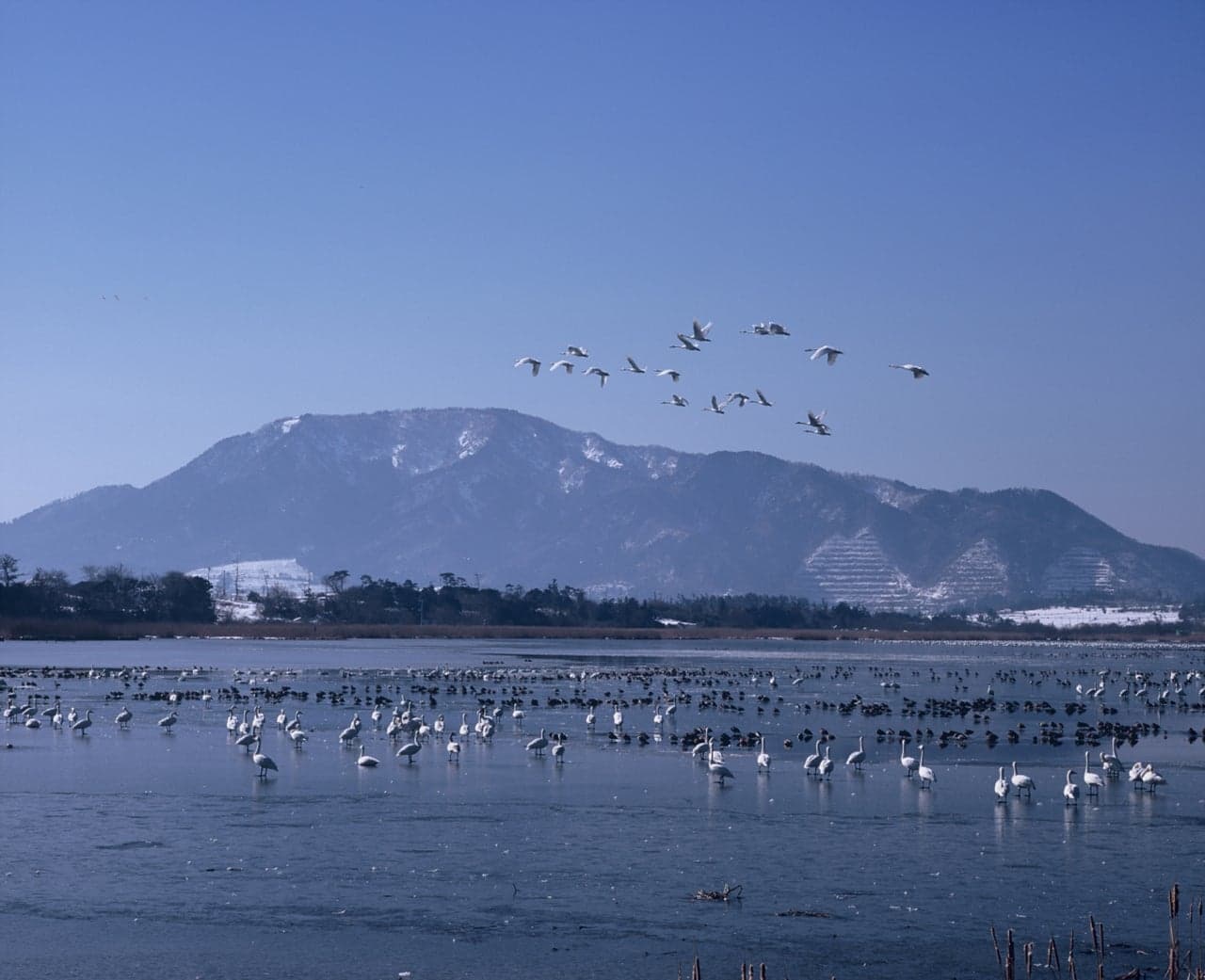 新潟市は白鳥飛来数が全国1位。佐潟、鳥屋野潟、福島潟の三つの潟湖には沢山の白鳥が訪れます。佐潟は国内最大の「砂丘湖」で、砂丘と砂丘の間のくぼ地に水がたまって出来た潟湖。貴重な水生植物が数多くみられ、冬は様々な渡り鳥の飛来地になります。