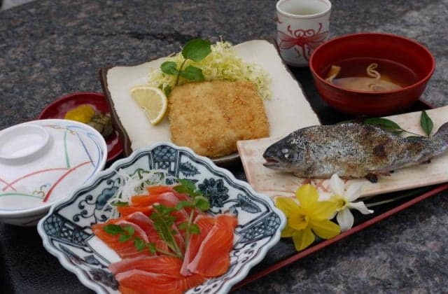 恵まれた気候と水を利用し、東北随一の施設と生産量を誇る養魚場で採れるニジマスを料理/加工しています。