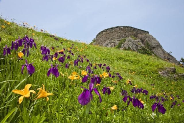 西洋の古城のような佇まいの葦毛崎展望台。太平洋が一望でき、種差海岸随一の眺望スポットである。隣接する中須賀までの一帯は四季折々の海浜植物や高山系植物が咲き乱れるスポットであり、みちのく潮風トレイルのコースとなっている。アクセスの際は種差海岸遊覧バス「ワンコインバス・うみねこ号」がおすすめ。