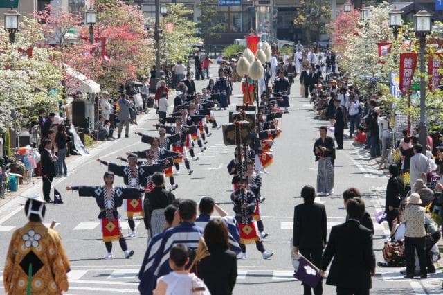 まつり前日は、役付・金棒・先箱・毛槍による「夜参り行列」が実施されます。19時に白壁通りを出発し、天満宮まで夜の町中を練り歩きます。まつり当日は、メインイベントの「大名行列」のほか、イベント満載です。「大名行列」は13時に天満宮を出発し、拍子木のリズムに合わせて、先箱・毛槍の華麗な演技が市内各所で披露されます。金棒のリズムに合わせての総勢200名、長さ約500mの大名行列は、時代絵巻を再現したかのようです。