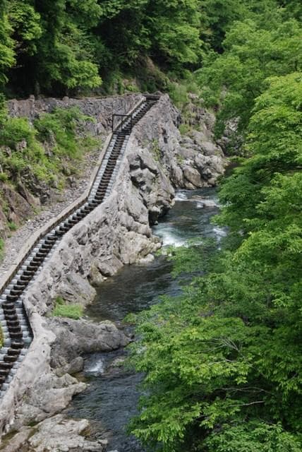 白い奇岩と深い峡谷美が印象的な鳩ノ巣渓谷探勝コース。ハイライトは途中の吊橋,鳩ノ巣小橋からの風景。ゆっくり歩いて駅までもどっても小1時間のコース。岩場が多いので足元に注意を。上流は白丸湖を経て海沢への遊歩道が続く。
