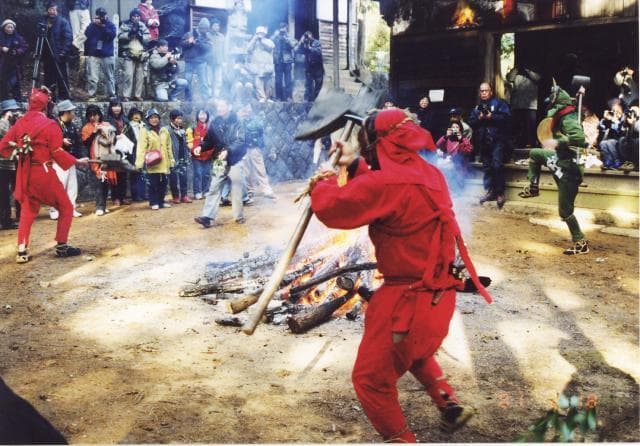 当日の午前中に準備を整え、午後からは子供たちと一緒に神社へ登ってきて、式次第27番が行われます。大祓や神歌など神事につづいて田遊びの行事22番が堂内で行われ、田打ちや田植えは子供が主役となって、田に見立てた太鼓を打ちながら囃して回ります。33番の惣田楽から前庭に出て、面の舞が行われます。「火の禰宜」「お女郎」「翁」の面につづいて三鬼の舞が登場します。三鬼の舞は花祭りの役鬼(山見鬼榊鬼、茂吉鬼)のように、一番鬼は反閇を踏み、三番目の茂吉鬼は、槌を持って舞います。笛の囃しや装束もたいへん似ています。