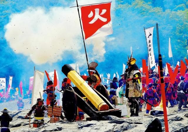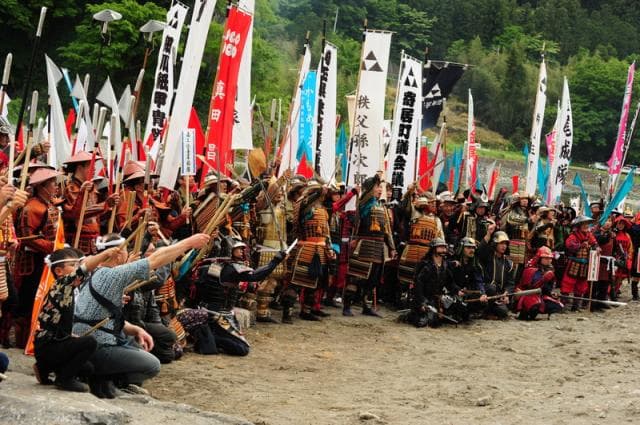 1590年、豊臣秀吉の小田原攻めの時、鉢形城に陣取った郷土の武将北条氏邦は、5万人の豊臣勢を相手に、わずか3,500人の兵力で1ヶ月余り攻防戦を続けました。この時の戦いを再現したものが「寄居北條まつり」です。祭りの当日は、大勢の武者隊たちが登場。市街地をパレードした後、北条・豊臣の両軍に分かれて、荒川を挟んで攻防戦を行います。その様子は、戦国時代の合戦さながらの迫力です。