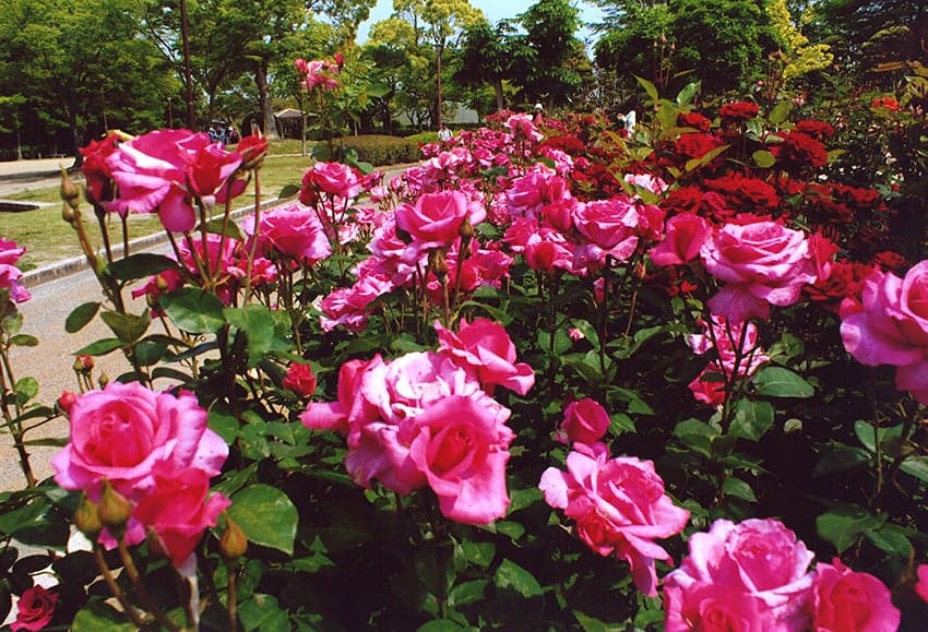 徳島城跡一帯を整備した公園。遊歩道を進むとバラ園があり、甘い香りを漂わせている。