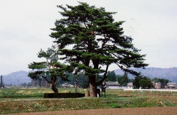 ~当時を語り伝える古木~ 古くから親しまれていた赤松で、樹高約14.5m、目通り3.7m、推定樹齢200年の見事が独立樹。江戸時代、南北に通ずる古道の要所にあり、現在の安曇野市、大町市へと通じていました。西に観勝院、南に大和田神社があり、この辻の扇の要となっていました。塩の道もこの松の木の横を通っていました。地域住民がこの松を一本松を村の名木として保護してきたが、村でも松川村天然記念物第1号に指定し、保護に力を入れている。