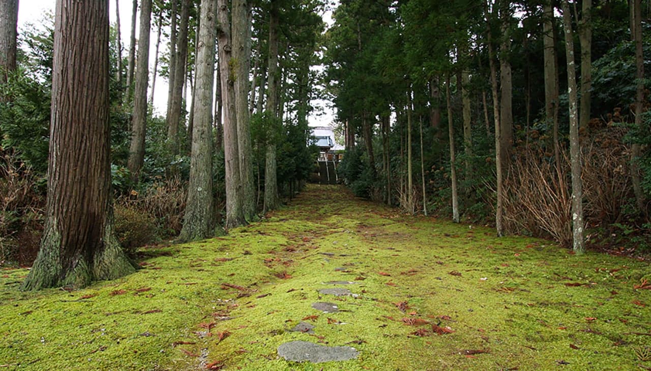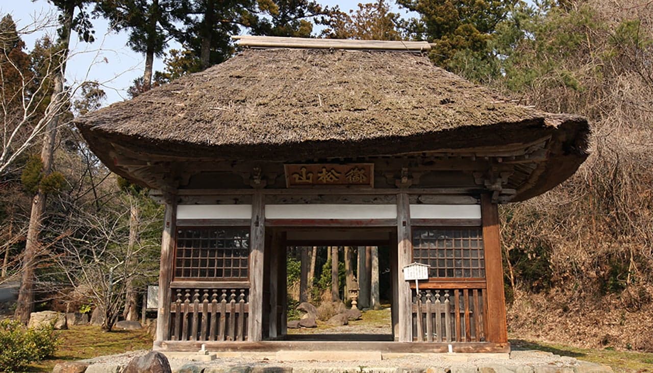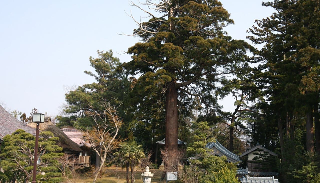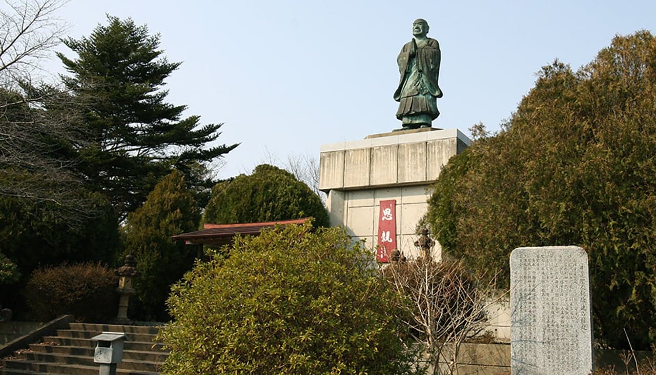 一谷(いちのさわ)の配所に移った日蓮聖人が、毎朝この丘に立ち、妙法を唱えたと伝わります。境内には郷里安房の両親をしのびながら朝日を拝む「思親」の銅像や「袈裟掛けの松」「御手清水」などが点在するほか、樹齢1000余年の巨木「三光の杉」(市の天然記念物)が枝を伸ばしています。