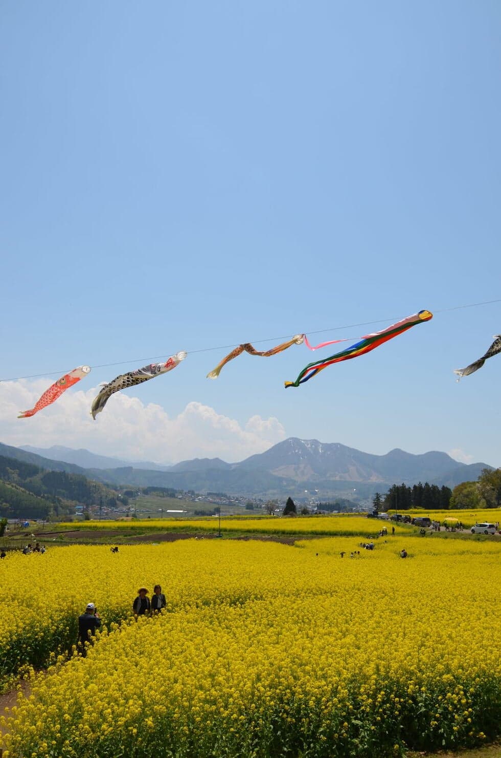 見わたす限りいちめんが菜の花の鮮やかな黄色で覆われる菜の花公園は、唱歌「朧月夜」でモチーフとなった場所です。