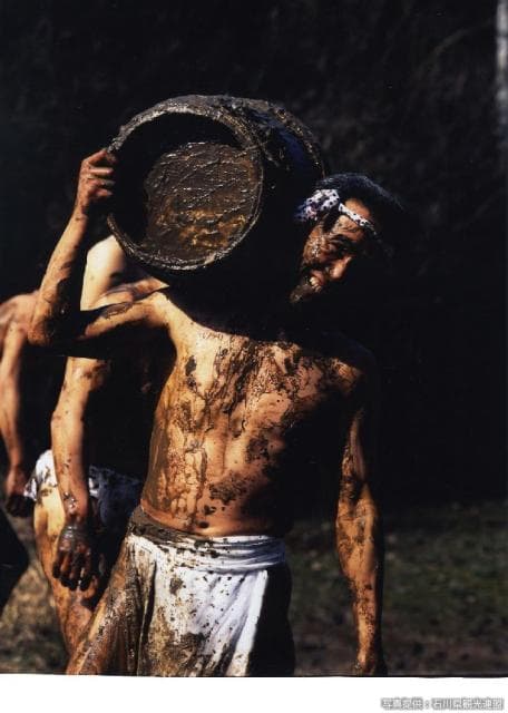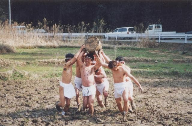 1斗入りの酒樽を供え、祝詞を奏上後、島崎の網・赤倉の網の両網から選ばれた若者達が身を清め、新しいふんどし一つで酒樽をかつぎ出し、田や海の中で奪い合います。両網の境から自分地内へ引き入れた方が、その年大漁豊作になるといわれています。