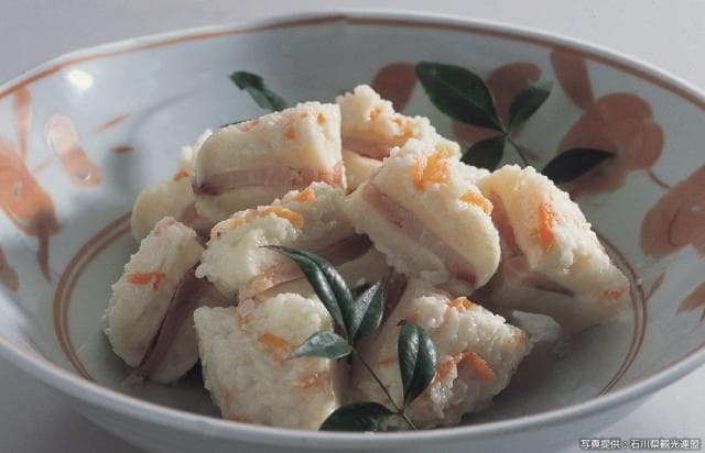 塩漬けしておいたかぶら(かぶ)の輪切りに寒ブリの身をはさみ、米麹で漬け込み発酵させたもの。