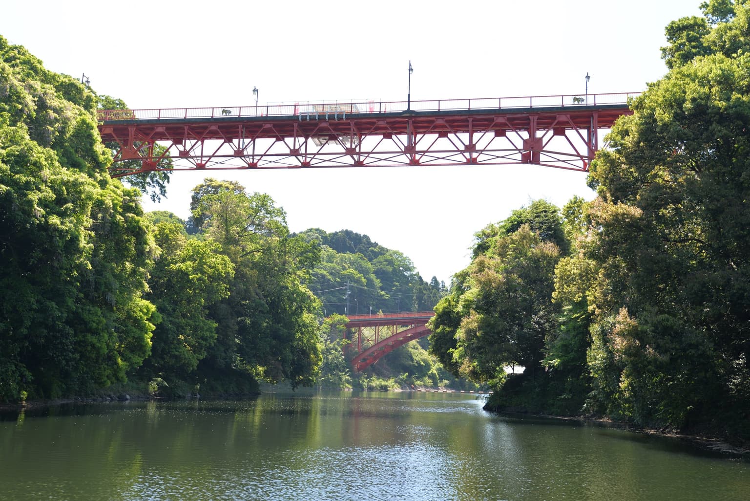 昭和6年に信貴山朝護孫子寺への参道として架けられた朱塗りの橋。上路カンチレバートラス橋と呼ばれる珍しい形式の橋で、日本で現存する最古例として2007年度に国の登録有形文化財となりました。