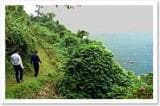 駟馳山は、日本海に面する山で、波で削られた平らな棚状の地形が発達しています。滝ヶ磯では、降雨後には水が滝のように流れ落ちる光景を見ることができます。約1キロの山道を登れば、生い茂った木々の合間から日本海や網代新港、鳥取砂丘などの絶景が広がっています。